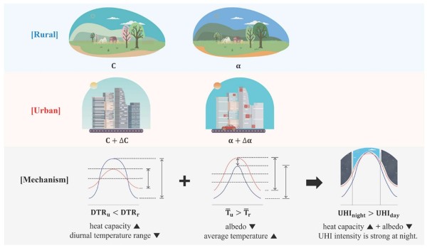 연구에 따르면, 도시는 낮 동안 태양복사를 통해 많은 열을 흡수하고, 그중 상당 부분을 건물, 도로, 콘크리트 같은 인공 구조물에 저장한다. 이 저장된 열이 밤에 천천히 방출되면서 도시가 주변 지역보다 더 늦게 식고, 야간 열섬 현상이 강화된다.